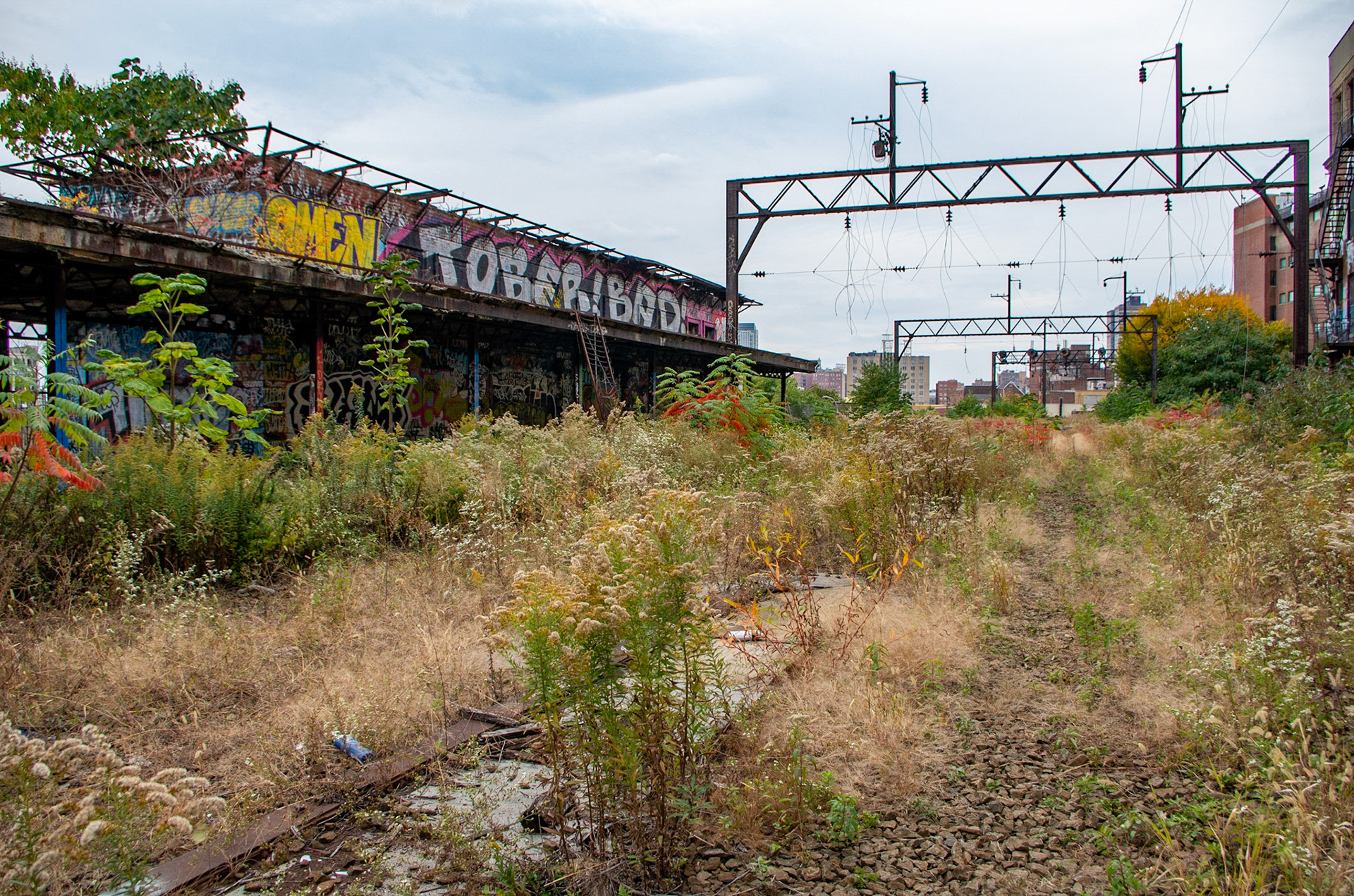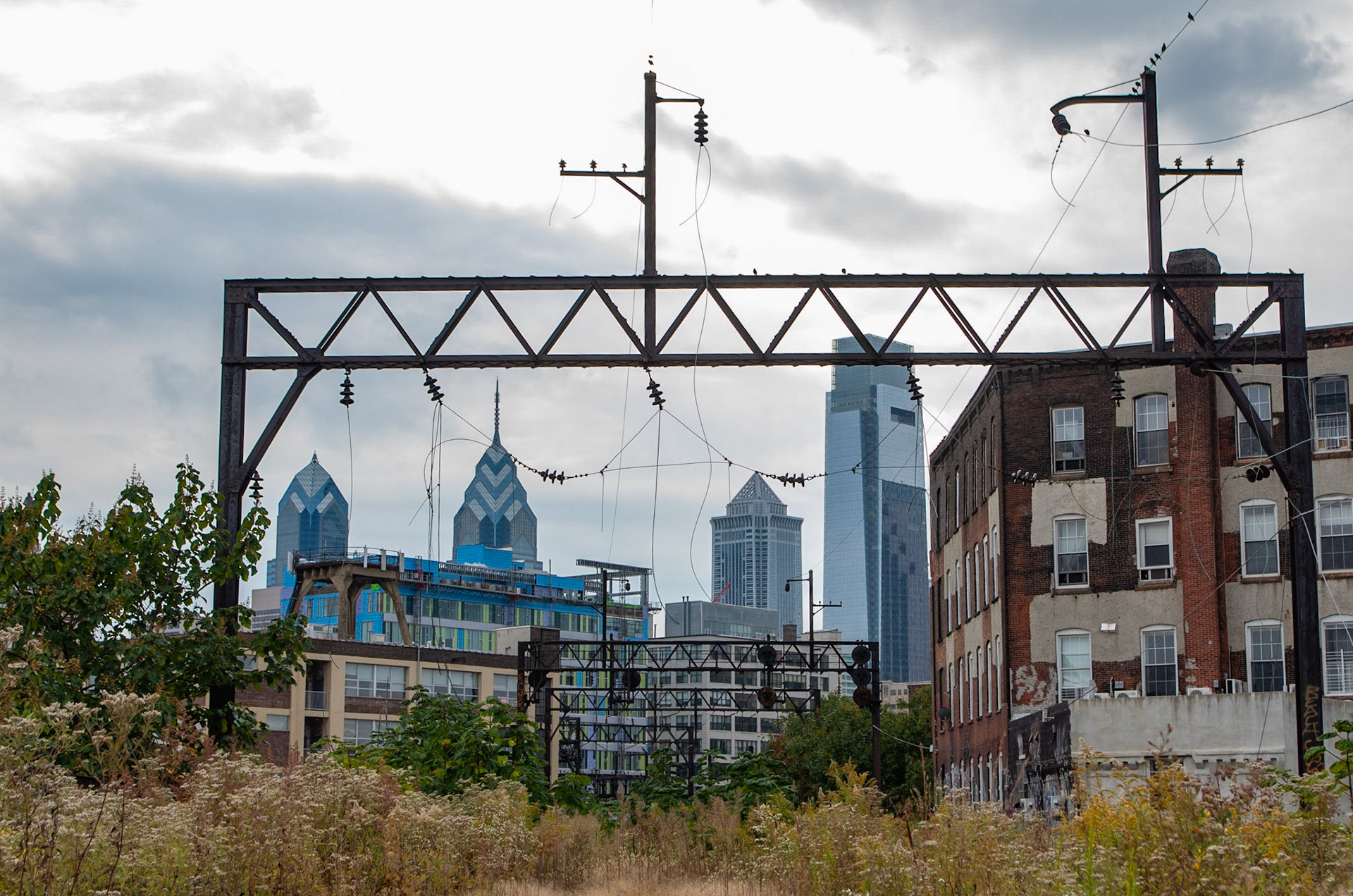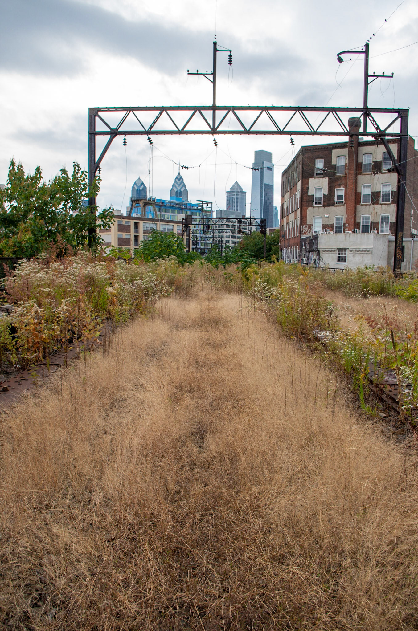 The remains of the Reading railroad's Philadelphia viaduct bypassed by a new line in 1985 left the signal and electrical transmission equipment in place, awaiting redevelopment as a linear pedestrian park in the future